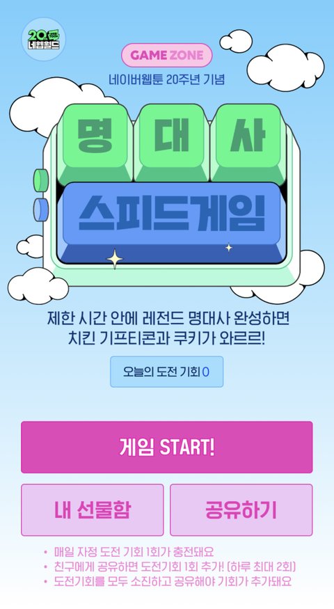 네웹에서 꽁으로 기프티콘 줌 웹툰 대명사 걍 누르면 되는데 그냥 대사 화면에 맞는 대사 순서대로 누르면 끝이더라 한 30초면 하는듯 쿠키랑 기프티콘 둘 다 주는데 생각보다 기프티콘 잘 나옴 앱 깔려있으면 한번씩 해보셈 실패해도 카톡으로 공유하면 다시 기회주더라 난 아까해서 두번 받음 ㅋㅋ
