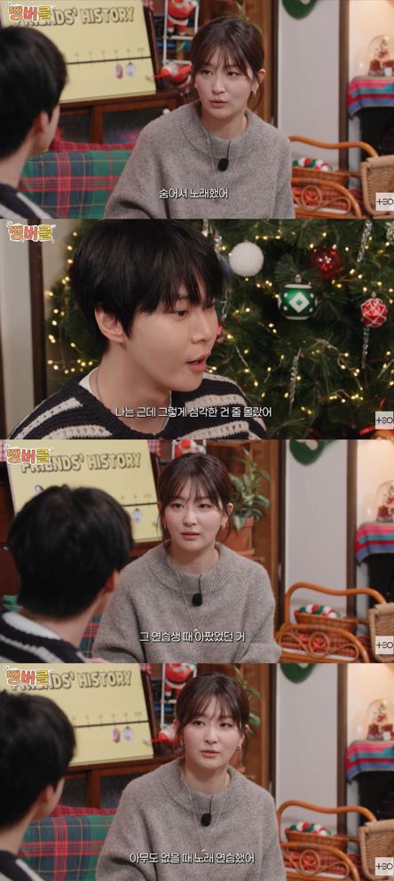 도영은 "그래서 누나가 그걸 이겨냈다는 게 너무 대단하게 느껴졌다"며 슬기에게 공감했다. 이어 슬기는 "그래서 연습생 때 숨어서 노래했다. 아무도 없을 때 노래 연습했다"는 사실을 털어놨다. 이에 "그래서 내가 너한테 물어봤잖아. '보컬 선생님 누구시냐' 너가 너무 꾸준히 노래 연습도 잘 하고 더 느는 거야. 그래서 저런 단련을 해야 되겠다 싶어서 물어봤던 거다"라고 당시 심경을 고백했다.
