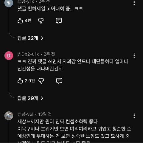 +뭐라 할까봐 말하는건데 성희롱 뭐라 하는거야 당연한거고 당연히 욕하는게 맞는데 너무 오바스러운거임 ㅋㅋㅋ유튜브영상인데 이상한사람 정상인사람 다 있는 곳인거 알면서 그 조그만한 성희롱 댓글도 용납 못하는게 너무 웃겼음..ㅋㅋ 걍 무시하면 되는걸 댓글로 성희롱 뭐 어쩌구 저쩌구 그것도 윈터,이안영상에서(둘다 같은 회사) 솔까 너무 티나는데? 솔까 걍 회사가 짜고 치는게 맞다고 봄 ㅇㅇ 그냥 성희롱 하는 사람들도 회사가 뒷돈 주고 시작하는 알바일 수 있다는 말~