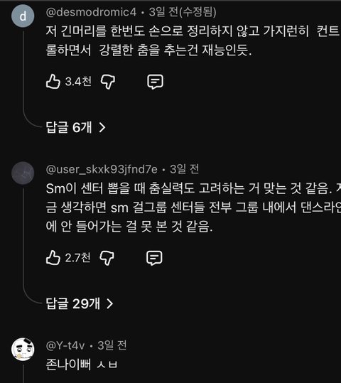 이정도면 그냥 회사에서 상황극을 짜신듯 하네;ㅋㅋ 이정도면 성희롱 댓글들도 그 회사(sm)알바 아닌가? 솔까 알빠는 아닌데 쇼츠에 계속 같은 영상만 우두두두 뜨니깐 너무 짜증남ㅋㅋ 제발 그만좀 바이럴해;; 카리나도 요즘 쇼츠 올라오던데;; 적당히좀 올리면 안 됨?