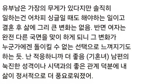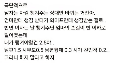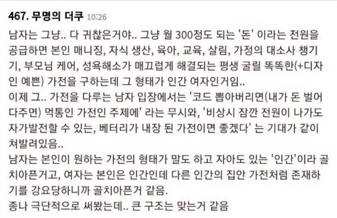 남자는 그냥. 다 귀찮은거야. 그냥 월 300정도 되는 '돈' 이라는 전원을 공급하면 본인 매니징, 자식 생산, 육아, 교육, 살림, 가정의 대소사 챙기 기, 부모님 케어, 성욕해소가 매끄럽게 해결되는 평생 굴릴 똑똑한( +디자 인예쁜) 가전을 구하는데 그 형태가 인간 여자인거임.. 이제 그. 가전을 다루는 남자 입장에서는 '코드 뽐아버리면(내가 돈 벌어 다주면) 먹통인가전인 주제에' 라는 무시와, '비상시 잠깐 전원이 나가도 자가발전할 수 있는, 베터리가 내장 된 가전이면 좋겠다' 는 기대가 같이 쳐발려있음..