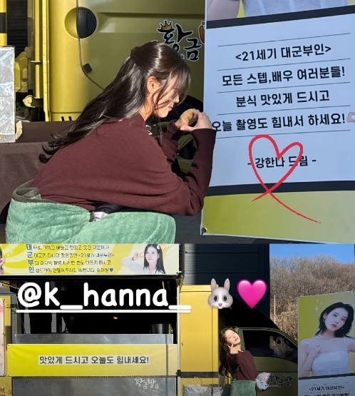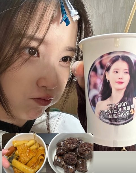 이번에 함께 공개된 사진에는 배우 강한나가 아이유 응원차 촬영장에 보내준 분식차 음식을 먹으며 즐거워하고 있는 아이유의 모습이 담겨있다.