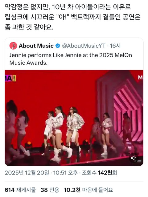 하지만 현실은 제니 조회수 혼자서 씹 압살에…다들 극찬이긔… 저렇게 골방에서 모여서 안티짓 하는 하등 몇명 빼곤.. 사실 까면서도 민망할듯 개완벽한무대 뭐라도 꼬투리 잡아야해서.. 반응 판만 다름 ㅋㅋㅋㅋㅋㅋㅋㅋ 판빼고 모든 커뮤 다 대통합제니찬양~메롱