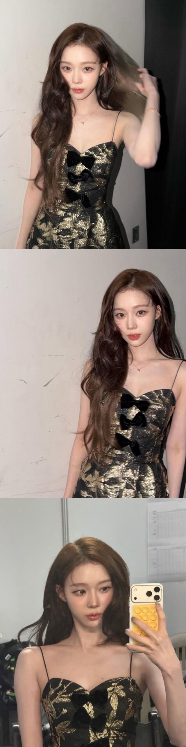 공개된 사진 속 윈터는 얇은 스트랩의 블랙 드레스에 골드 패턴이 더해진 의상을 착용했다. 단아하면서도 고급스러운 분위기를 자아냈다. 중앙에 배치된 리본 디테일은 클래식한 무드를 강조하며 시선을 끌었다.