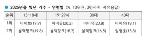3세대 여돌인 블핑이 102030 걸그룹 1위인거 개 신기하고 아이유는 데뷔한지 이제 20년이 거의 다되어가는데도 아직도 인기많은거 신기하다 암튼 둘다 ㅈㄴ 레전드들임