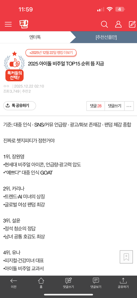 장원영 태용 진짜로 아이돌 비주얼 1위했는데, 진짜로 비주얼 순위는 쳇지피티가 정한건데 그러고 보니까 추천만 2개 있고