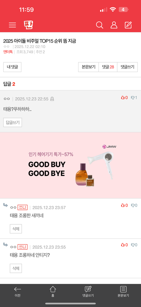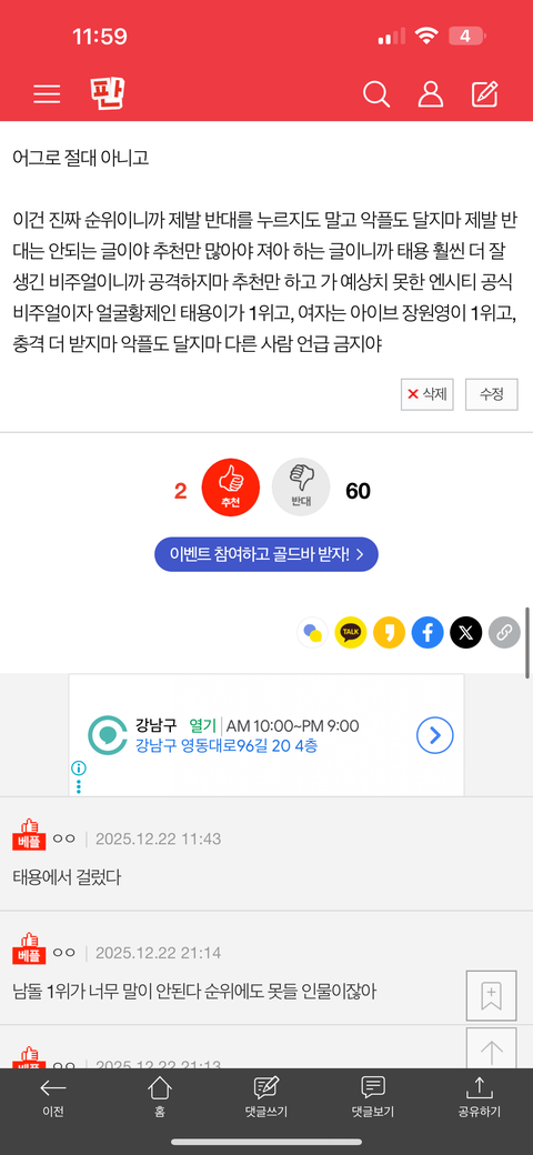 너네 태용 앞에 왜 그러냐? 태진차 태용이 화나게 만들려고 하잖아. 너네는 얼굴황제 태용이 1위하면 바로 악플 막 달고 욕하네. 누가 태용한테 그런거야? 도대체 왜 반대를 누른 이유를 얘기해봐, 추천도 누르고, 이유를 알아야 되겠음. 지금 아주 많이 궁금하다고 빨리 대답해봐.