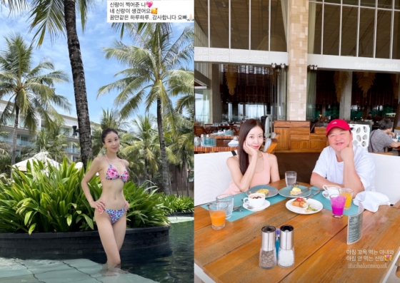 원진서는 24일 발리 신혼여행 사진들을 공개하며 자신의 비키니 자태를 뽐냈다.