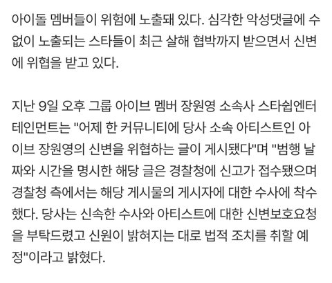 웃긴 게 장원영은 평소에 악플이나 루머 별로 신경 안 쓴다 이러고 강민경 유튜브 채널 나와서도 루머에 대해서 “마음도 쓰지 않았지” 이러고 맨날 여기저기서 본인 자존감 높고 멘탈 쎄다고 자랑하고 다니는데 탈덕수용소 고소 왜 한 거임? 노이즈마케팅 시켜주고 완전 럭키비키 아닌가? ㅈㄴ 말과 행동이 모순임 본인이 진짜로 신경 안 썼으면 선처해주길