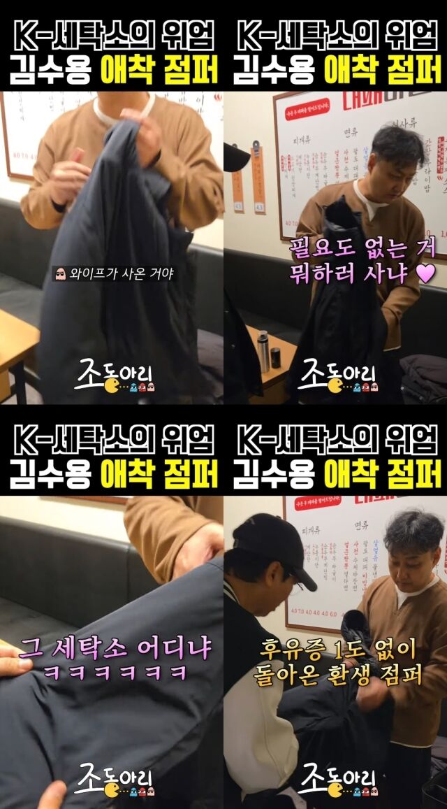 유튜브 채널 '조동아리'/유튜브 채널 '조동아리' 영상 캡처이후 이번 숏츠를 통해 김수용은 수선을 마친 점퍼를 공개했다. 그는 "와이프가 사 왔다. 나는 테무에서도 옷 사 입고 그런다. 필요도 없는 거 뭐 하러 사냐고 했다. 그런데…"라며 다시 한번 점퍼에 대한 애정을 드러냈다. 지석진은 "와이프가 마음을 썼네"라며 "그걸 잘랐으니. 이거 100만 원 넘는다"고 공감을 표했다.