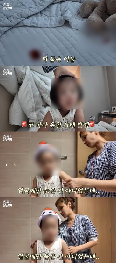 이날 윤진이는 딸의 방을 보고 깜짝 놀랐다. 침대 위 흥건한 피에 “뭐야 이거”라며 반응한 후 피 범벅이 된 딸의 얼굴을 공개했다.