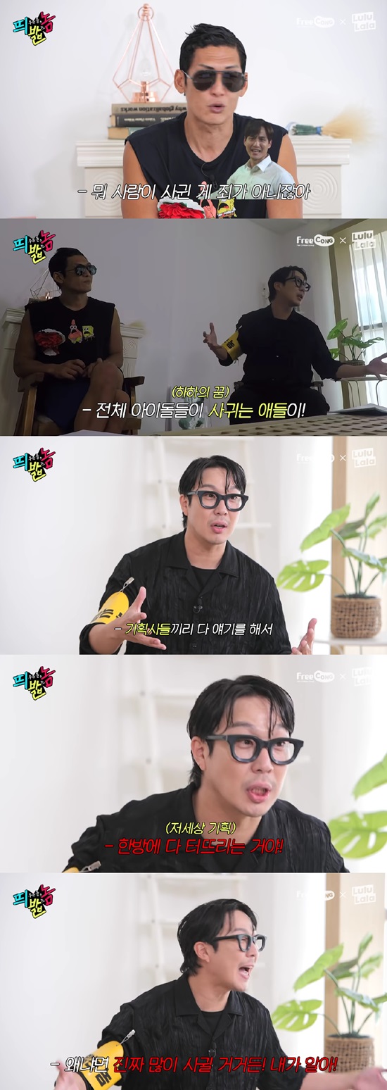 "이랬으면 좋겠어"라고 운을 뗀 하하는 "전체 아이돌 중 사귀는 아이들이 기획사끼리 이야기해 한방에 다 터트리는 거다. 누구 것을 (기사) 쓸지 모르게 하는 거다"라며 발상의 전환이 필요하다고 이야기 했다.