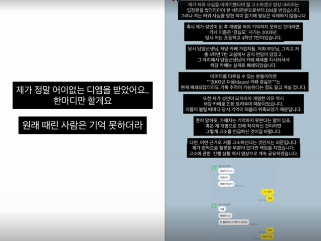 그러면서 나름은 “데이터를 다루실 수 있는 분이라며 2003년 다음 카페 경싫모는 현재 폐쇄되었더라도 기록 추적이 가능하다는 점도 알고 계실 겁니다”라며 “또한 제가 성인이 되자마자 개명한 이유 역시 해당 카페로 인한 트라우마 때문이었다”고 설명했다. 나름은 “흔히 말하듯, 가해자는 기억하지 못한다는 말이 있죠. 혹은 제 개명으로 인해 착각하신 것이라면 그렇게 고소를 언급하신 것이길 바랍니다. 다만, 어떤 근거로 저를 고소하신다는 것인지는 의문”이라며 지인과 나눈 카톡을 공개하기도 했다.