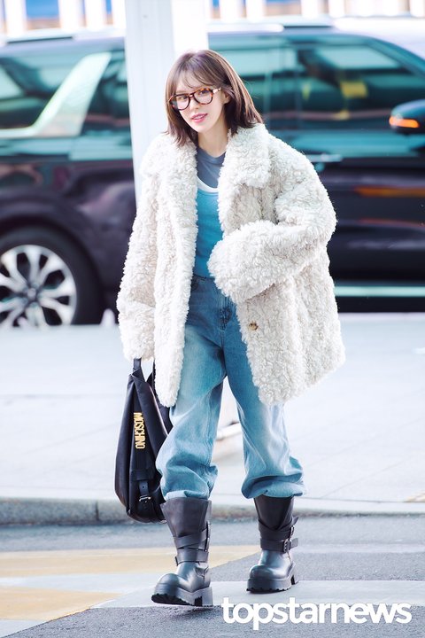 이날 스타일의 중심은 부드러운 텍스처가 돋보이는 아이보리 컬러의 부클 코트였다. 풍성한 볼륨과 자연스럽게 떨어지는 실루엣이 겨울 무드를 극대화하며, 이동이 많은 일정에도 부담 없는 여유로운 핏을 완성했다. 코트 안쪽에는 블루 톤의 레이어드 티셔츠를 매치해 컬러 대비를 살렸고, 과하지 않은 색 조합으로 전체적인 스타일의 균형을 맞췄다.