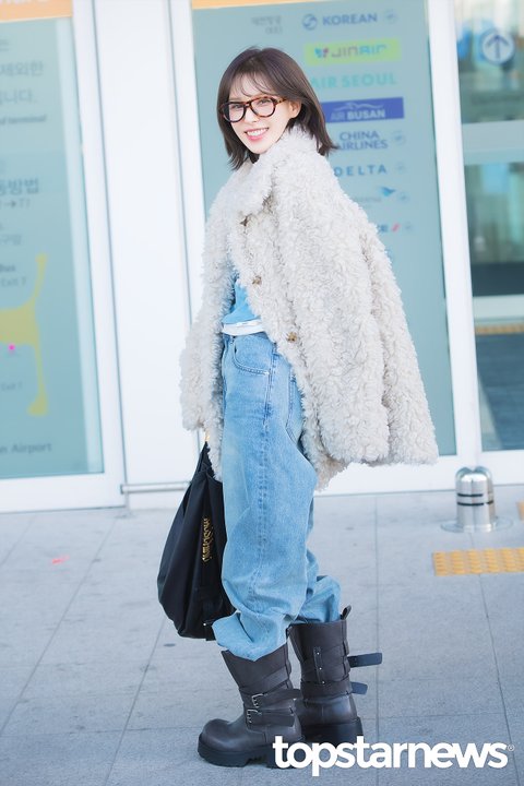 하의는 워싱이 살아 있는 스트레이트 핏 데님 팬츠를 선택해 캐주얼한 분위기를 강조했다. 여기에 볼드한 블랙 워커 부츠를 매치해 룩에 힘을 더했으며, 안정적인 굽과 견고한 디자인이 실용성과 스타일을 동시에 만족시켰다. 손에 든 블랙 컬러 토트백은 브랜드 로고가 보이는 심플한 디자인으로 룩의 마무리를 책임지며 공항 패션 특유의 실용성을 드러냈다.