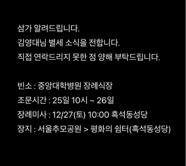 25일 김영대의 공식 SNS에는 “삼가 알려드린다. 김영대님의 별세 소식을 전한다. 직접 연락드리지 못한 점 양해 부탁드린다”며 부고를 알리는 게시물이 게재됐다.