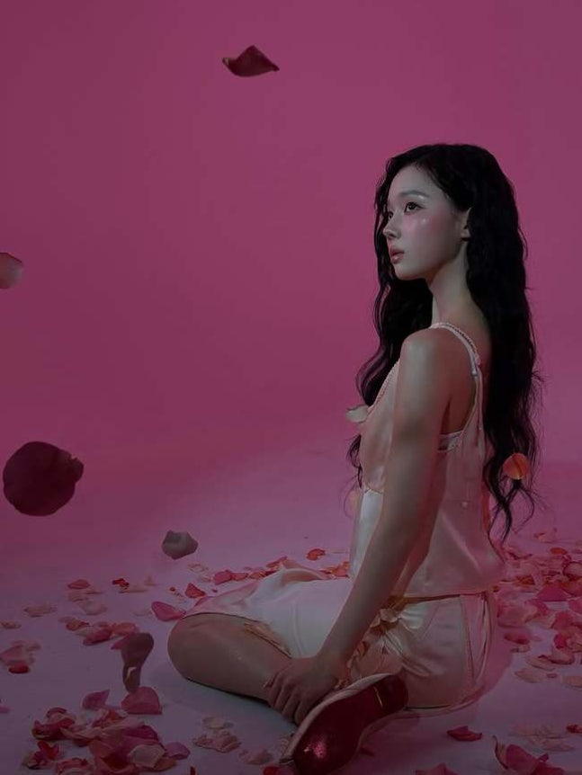 에스파 윈터 소셜미디어긴 웨이브 머리를 하고 있는 윈터는 연한 분홍색 배경으로 촬영에 임하고 있다. 그의 오른손에는 한 송이의 꽃이 자리했다.