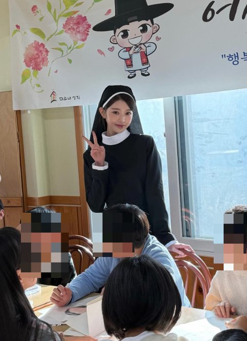 공개된 사진 속 장원영은 수녀 복장으로 아이들을 돕고 있다. 또한 그는 빨간 장갑과 트리로 크리스마스 분위기를 내고 있다.