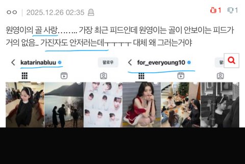 카리나를 좋아할려고 해도 카리나팬ㄴ들이 또 카리나랑 비교하면서 애꿎은 장원영을 욕하니깐 카리나를 좋아할려다가도 못좋아하게 만드는거 같음ㅉ지금도 카리나팬이 추하게 다른 그룹 여돌인 원영이를 욕하고 있더라ㅉ칼프들은 하나같이 다 비호감짓을 못해서 안달난거임?ㅉ