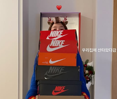 사진에는 루돌프 머리띠에 가운을 입고 있는 방민아의 모습이 담겼다. 그는 신발 박스 여러 개를 들고 정면을 응시 중이다. 결혼 후 첫 크리스마스를 맞은 새신부의 모습이 시선을 사로잡는다.