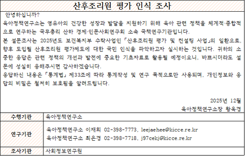 "출산 계획"이 있으신 여성분들 대상으로 '산후조리원 평가 인식조사'를 실시합니다.