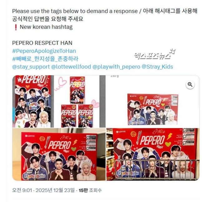 (엑스포츠뉴스 이예진 기자) 캐나다에서 판매된 빼빼로와 스트레이 키즈 협업 패키지에서 멤버 한(HAN)의 이미지가 누락된 사실이 알려지며 팬들의 항의가 이어지고 있다.