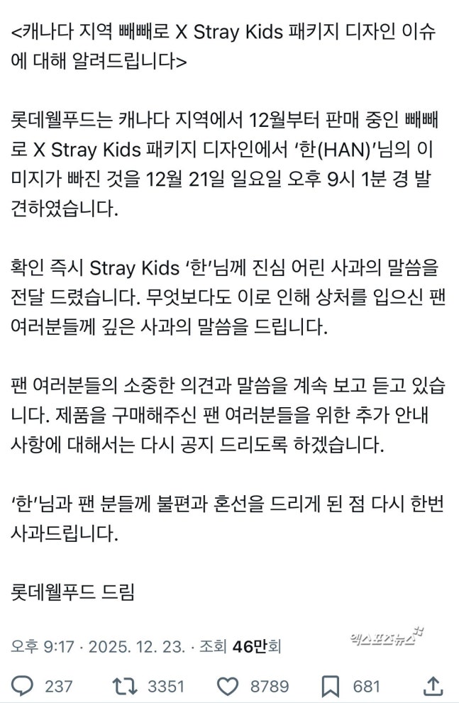 논란이 커지자 롯데웰푸드는 23일 공식 사과문을 게시하고 사실을 인정했다. 롯데웰푸드는 “캐나다 지역에서 12월부터 판매 중인 빼빼로 X 스트레이 키즈 패키지 디자인에서 ‘한’의 이미지가 빠진 것을 확인했다”며 영어와 한국어로 사과문을 올렸다.