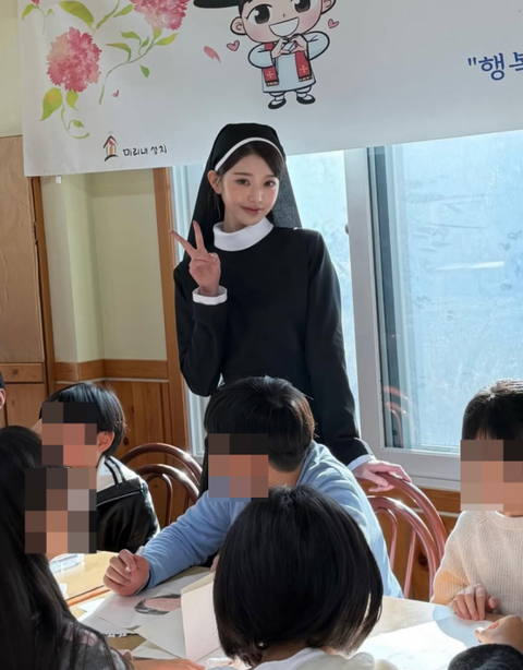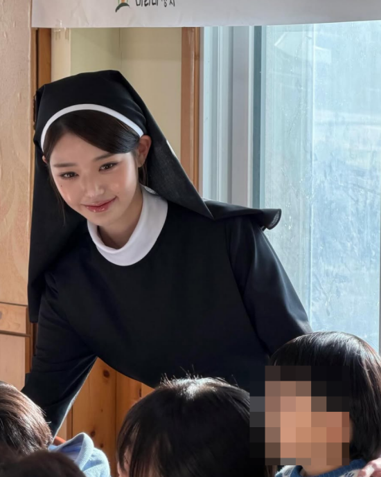 장원영 SNS.촬영을 위해 화려한 아이돌 의상이 아닌, 수녀복을 입은 장원영은 아역 배우들과 함께 즐거운 시간을 보내고 있다.