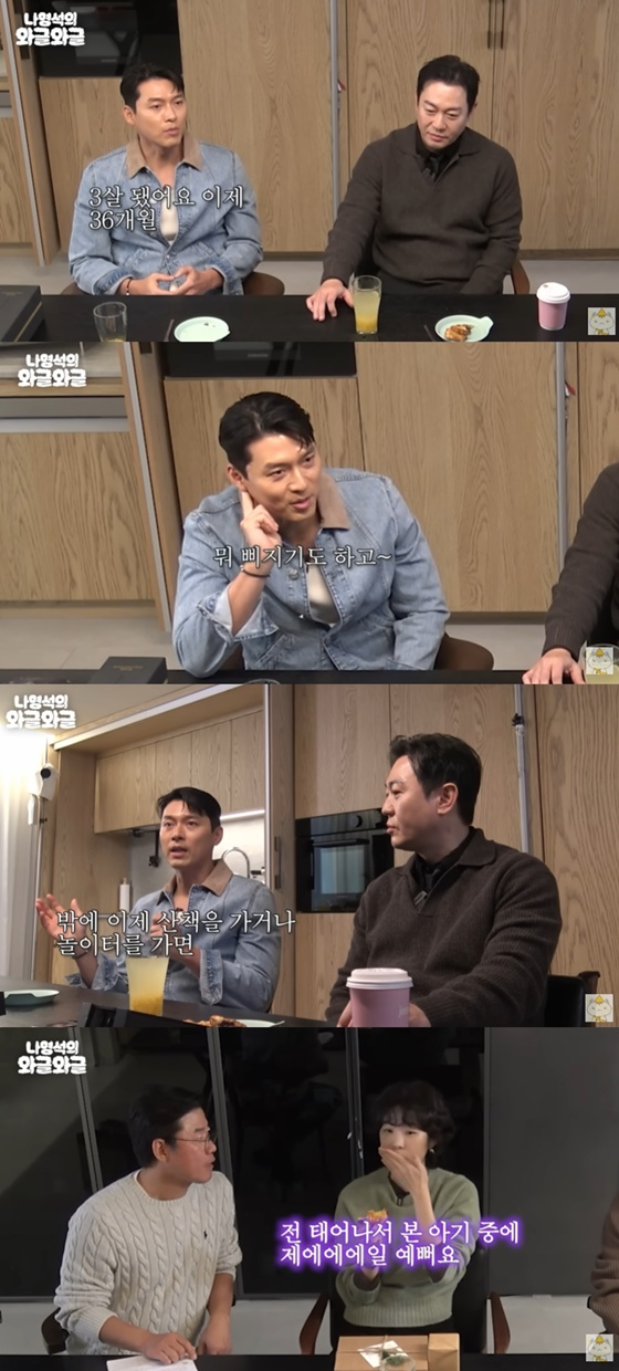 배우 현빈, 손예진 부부의 아들이 언급됐다.26일 유튜브 채널 '채널십오야'에는 '디즈니 출신(?) 배우들끼리 크리스마스 기념 와글ㅣ나영석의 와글와글'이라는 제목의 영상이 올라왔다. 게스트로 디즈니+ 시리즈 '메이드 인 코리아' 주역 배우 현빈, 박용우, 우도환, 서은수가 출연했다.