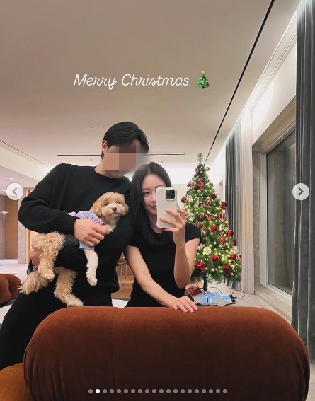한예슬은 집 안에 꾸며진 크리스마스 트리를 배경으로 남편과 함께 거울 셀카를 남기고 있다. 블랙 컬러의 심플한 커플룩을 맞춰 입은 두 사람은 반려견을 품에 안은 채 편안하면서도 달달한 분위기를 자아냈다.