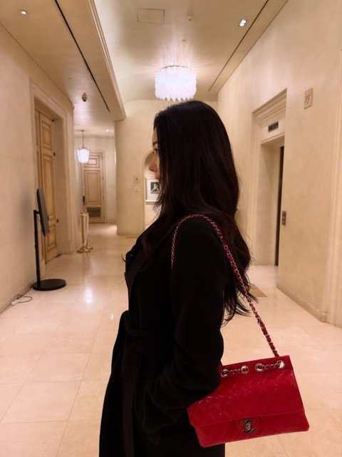 공개 된 사진 속 김사랑은 은은한 조명이 내려앉은 실내 복도에 서서 옆모습을 드러내고 있다. 블랙 코트로 정제된 실루엣을 강조했고 어깨에 멘 레드 퀼팅 체인백이 포인트로 더해져 단아함과 강렬함을 동시에 완성했다. 길게 흐르는 웨이브 헤어는 자연스럽게 내려와 얼굴선을 부드럽게 감싸고, 고개를 살짝 든 채 앞을 바라보는 시선이 고요한 긴장감을 만든다. 크림 톤 벽과 대리석 바닥, 샹들리에 조명이 어우러진 공간에서 절제된 스타일링이 또렷하게 살아난다.