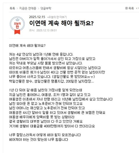 헤어지고 마음 추스른 후에 글을 작성합니다, 많은 분들이 그러더라고요 애인에게 쓰는 돈을 아끼는 사람은 걸러라고... 왜 그런지 알 것 같습니다. 사랑도 현명하게 해야 예쁜 사랑 할 수 있는 것 같아요. 제 글에 댓글 작성해 주신 분들 감사드립니다. 25년 마무리 잘 하시고 새해 복 많이 받으세요.