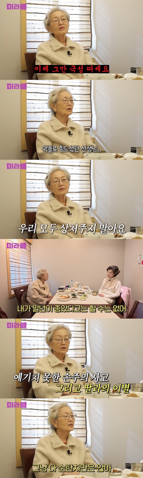김영옥은 예상치 못한 교통사고로 반신마비가 된 손자, 딸과의 이별을 언급하며 "일흔 아홉 살 때 혼난 것 같다. 나이가 들면서 할아버지도, 나도 아프다. 내일이 어떻게 될지 모른다"고 전했다.