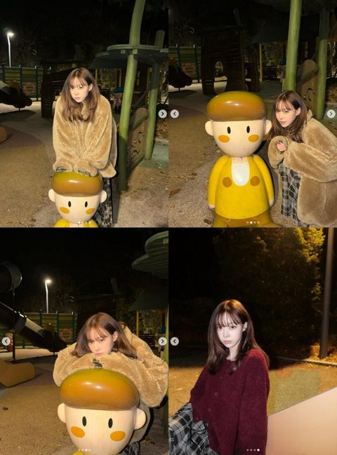 사진 속 윈터는 한 놀이터에서 캐릭터 조형물과 함께 다채로운 포즈를 취하고 있는 모습. 윈터는 브라운 컬러의 포근한 퍼 재킷을 입고 캐릭터 머리 위에 턱을 괴거나 나란히 서서 카메라를 응시하고 있다.
