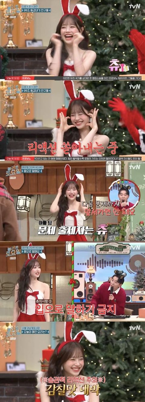 이날 붐은 츄에 대해 “리액션 요정이다. 리액션이 한 템포 빨라서 트러블이 있었다. 지난번에도 아직 화면에 나오지도 않았는데 ‘우와’ 했다”라고 말했다.