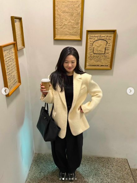 공개된 사진 속 류이서는 카페로 보이는 공간에서 커피를 들고 포즈를 취하고 있다. 아이보리 컬러의 재킷과 블랙 이너, 슬랙스를 매치한 스타일링으로 단정하면서도 세련된 분위기를 자아냈다.