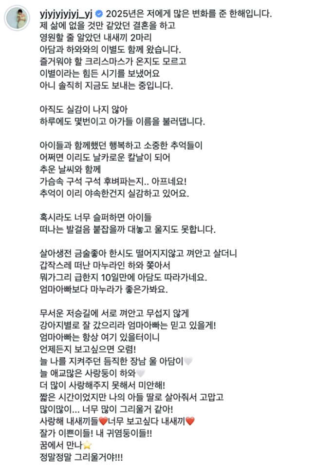 최여진은 “즐거워야 할 크리스마스가 온지도 모르고 이별이라는 힘든 시기를 보냈고, 지금도 보내는 중”이라며 “아직 실감이 나지 않아 하루에도 몇 번씩 아이들의 이름을 부른다”고 털어놨다. 특히 그녀는 “행복했던 추억들이 오히려 날카로운 칼날이 되어 가슴 속 구석구석을 후벼파는 듯한 통증을 느낀다”며 절절한 그리움을 전했다.