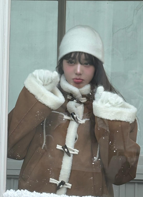 사진 속 장원영은 이른바 '떡볶이 코트'에 흰색 장갑과 비니 모자를 쓰고 귀여운 매력을 발산했다.