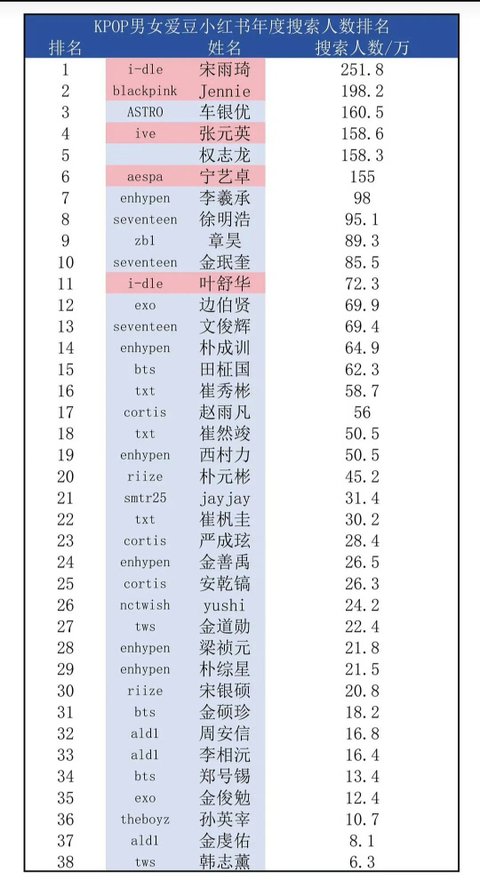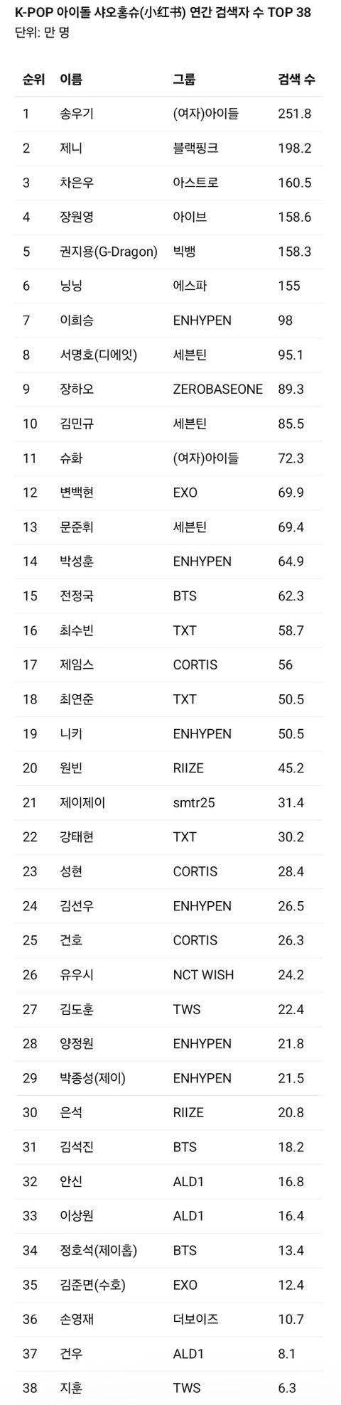 K-POP 아이돌 샤오홍슈(小红书) 연간 검색자 수 TOP 38