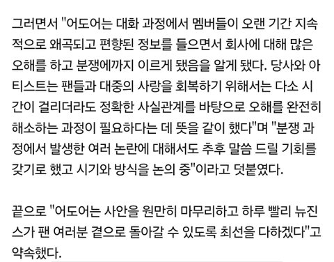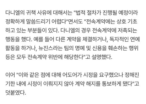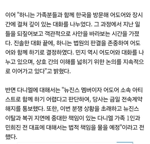 뭔가 우리가 모르는 사유가 있겠지. ... 방금 뜬 기사보니까 하니 민지 가족들은 어도어와 대화를 충분히 나눴대 근데 이번 분쟁 상황을 초래하고 뉴진스 이탈과 복귀 지연에 중대한 책임이 있는 다니엘 가족 1인과 민희진 전 대표에 대해서는 법적 책임을 물을 예정입니다. 이러는걸로 봐서 민희진과 함께 의견을 같이하게된 최초의 가족이 다니엘 가족일수도 있다는 추측이 드네... 정확한건 모르지만