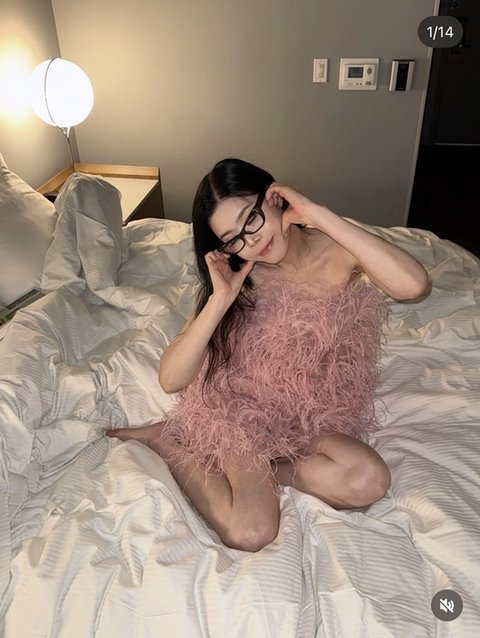 공개된 사진 속 린은 검은색 뿔테 안경에 핑크색 오프숄더 드레스를 입고 침대 위에서 포즈를 취하고 있다. 핑크색 깃털이 뒤덮인 드레스 아래로 군살 없이 쭉 뻗은 다리와 쇄골라인이 드러나 시선을 모았다.