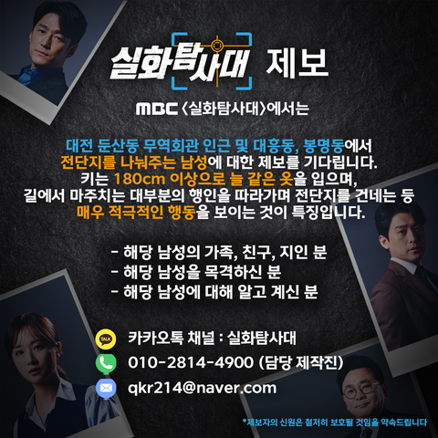 MBC <실화탐사대>에서는 대전 둔산동 무역회관 인근 및 대흥동, 봉명동에서 전단지를 나눠주는 남성에 대한 제보를 기다립니다. 키는 180cm 이상으로 늘 같은 옷을 입으며, 길에서 마주치는 대부분의 행인을 따라가며 전단지를 건네는 등 매우 적극적인 행동을 보이는 것이 특징입니다.