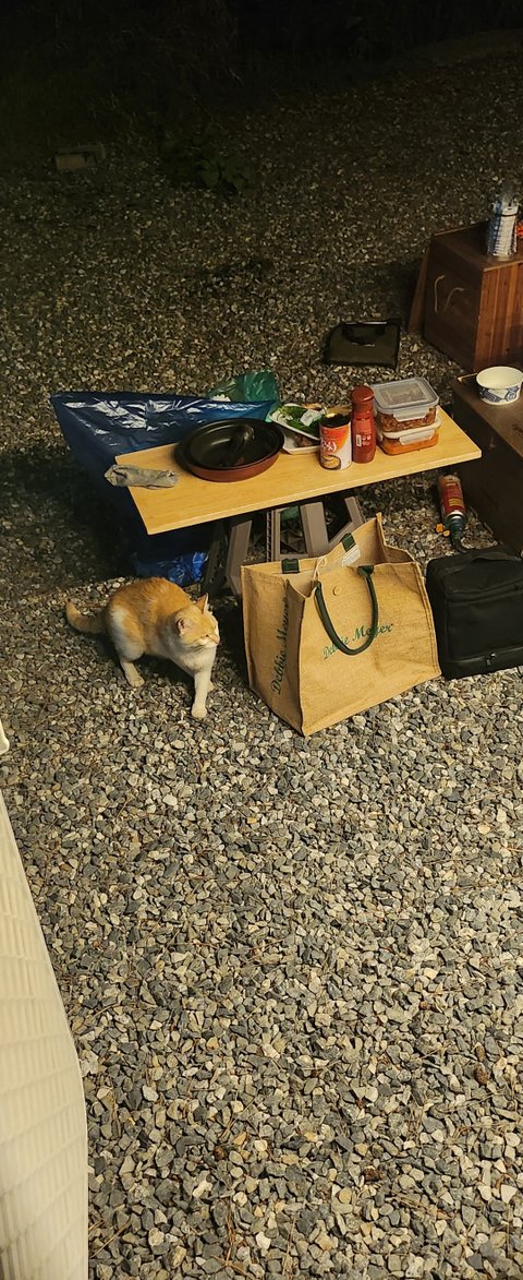캠핑장에서 뭐 훔쳐먹으려다 걸려서 스탭 꼬인 고양이