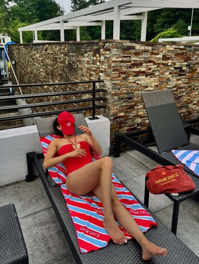 한그루 소셜미디어한그루는 강렬한 붉은색 비키니를 입고 등장했다. 그는 선베드에 앉아 자신의 각선미를 자랑하기도 했다. 또한 다양한 비키니를 착용한 모습을 공개해 시선을 끈다.