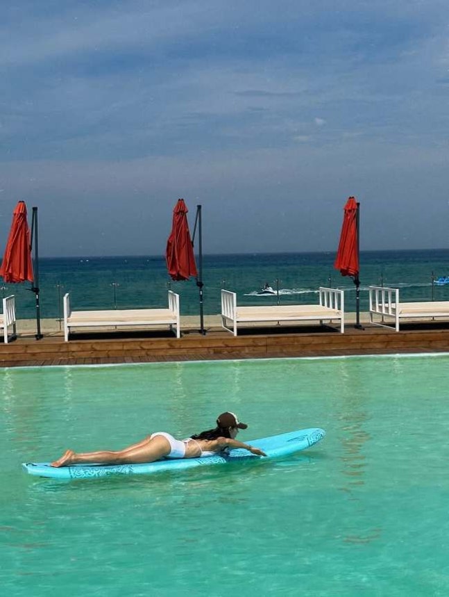 한그루 소셜미디어그뿐만 아니라 한그루는 하얀색 비키니를 착용하고 서핑을 즐겼다. 그는 진지한 모습으로 서핑 보드에 누워 물살을 갈랐다.