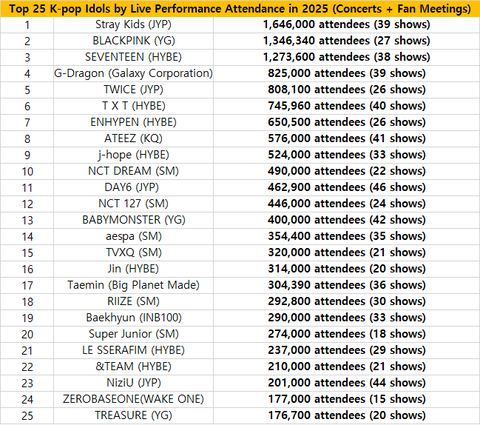 2025년 케이팝 아이돌 LIVE공연(콘서트+팬미팅) 관객동원수 TOP25