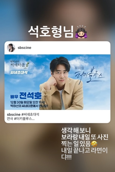 박하선 소셜미디어알고 보니 이날 씨네 초대석으로 꾸며진 SBS 파워FM '박하선의 씨네타운'에 배우 전석호가 게스트로 출연하기 때문. 박하선은 생방송으로 전석호와 함께 이야기를 나눌 예정이다.