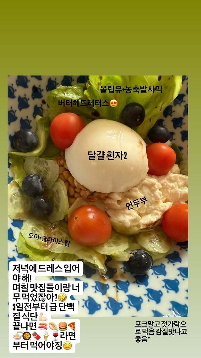 박하선 소셜미디어박하선의 식단은 올리브유와 농축 발사믹, 버터 헤드 레터스, 달걀 흰자 두 개, 연두부였다. 그는 "포크 말고 젓가락으로 먹으면 감칠맛 나고 좋음"이라고 하기도 했다.
