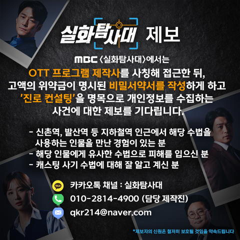 MBC <실화탐사대>에서는 OTT 프로그램 제작사를 사칭해 접근한 뒤, 고액의 위약금이 명시된 비밀서약서를 작성하게 하고 '진로 컨설팅'을 명목으로 개인정보를 수집하는 사건에 대한 제보를 기다립니다.