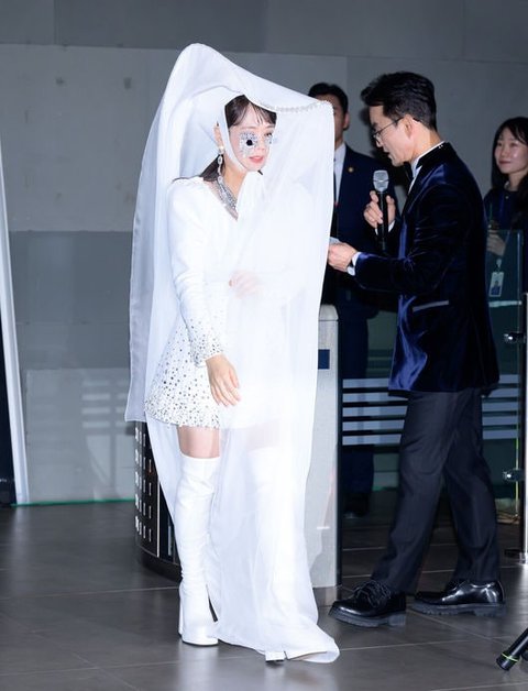 순백의 미니 드레스는 섬세한 비즈 장식으로 화려함을 더했고, 바디 라인을 따라 자연스럽게 떨어지는 실루엣이 우아한 분위기를 완성했다. 특히 어깨 라인부터 길게 흘러내리는 케이프 형태의 디테일은 마치 베일을 연상케 했다.